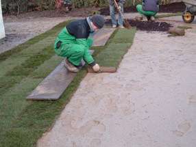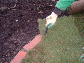 Start by laying the first row along the longest straight line and work across the area staggering the joints in each row – as in brickwork. Butt and push the edges and ends against each other but do not stretch the turf too much.